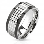 De chaque côté de l'onyx, des pierres claires, probablement des zircons, sont minutieusement incrustées dans l'acier. Ces huit pierres, disposées en deux colonnes symétriques, créent un contraste lumineux avec l'onyx sombre, ajoutant une dimension raffinée à l'ensemble. Ce mélange de matériaux noble apporte une brillance supplémentaire, faisant de cette bague un accessoire à la fois moderne et intemporel, idéal pour les hommes en quête d'un détail luxueux et distinctif dans leur garde-robe.